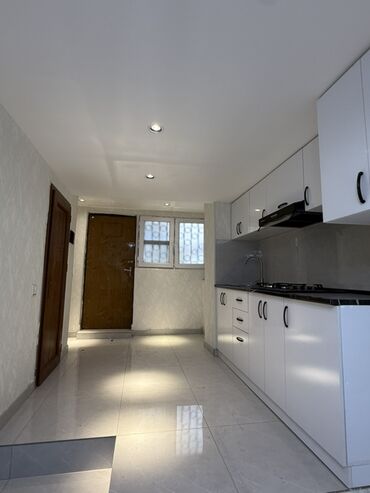 - Geniş mətbəx: Ağ rəngli MDF/qablaşdırılmış dolablar, qara rəngli qollar; qaz plitəsi və aspirator; paslanmayan poladdan ətəkli lavabo; iri parlaq kafel döşəmə; tavan spot işıqları; pəncərə və dəmir barmaqlıq; divarda zərif naxışlı üzlük.