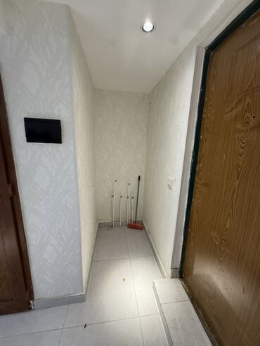 Satış üçün: kiçik həyət sahəsi və mətbəxi olan mənzil/ev interyeri - Giriş: Ağ rəngdə boyanmış divarlar, mərmər naxışlı keramika döşəmə plitələri, dekorativ metal giriş qapısı. Giriş hissəsində pə...