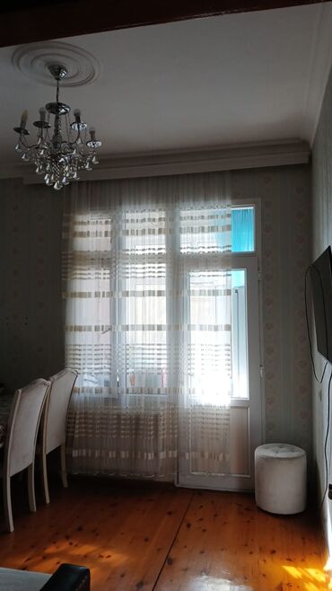 - Qonaq otağı/əziyyət otağı: asma kristallı çilçıraq, geniş pəncərə, zolaqlı tül pərdə, divar kağızı, dördnəfərlik masa və yumşaq oturacaqlar.