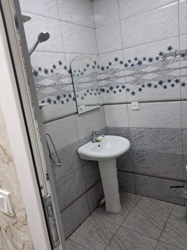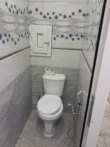 - Mətbəx: üst-alt dolablar, qaz plitəsi və çıxarıcı havaötürən, soyuducu, paltaryuyan maşın, işçi səth və aralıq hissədə mərmər naxışlı panel, qab-qacaq üçün rəflər.