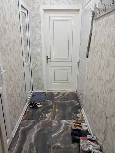 - Giriş: dekorativ divar kağızları, alçaq dolab/çəkmə yeri, güzgülü şkaf, mərmər naxışlı kafel döşəmə, asılqan.