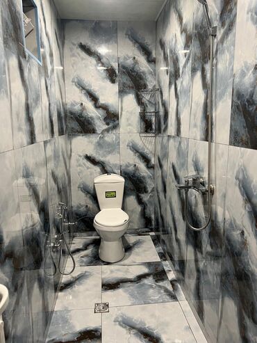 - Sanitar qovşaq: Duş zonası (divara montaj duş sistemi), asma duş tutacaqları, unitaz, bide duşu; mərmər effekti keramika plitələr və döşəmə süzgəci.