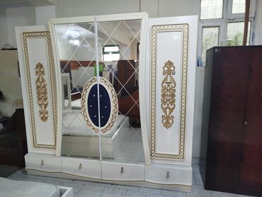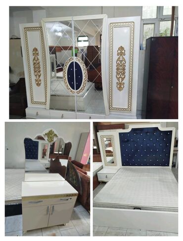 Yataq otağı mebel dəsti Tərkib: - Çarpayı: yumşaq başlıqla, qızılı dekor xətləri - Tumbo: 1 ədəd, dekorativ qızılı tutacaqlar, saxlama çekmesi. - Paltar şkafı: 4 qapılı, orta hissədə güzgülü qapıl...