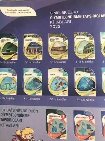 - Arxa səhifədə “Sınıflər üzrə qiymətləndirmə tapşırıqları kitabları 2023” seriyasından digər fənlərin (Azərbaycan dili, Ədəbiyyat, Azərbaycan tarixi, Ümumi tarix, Coğrafiya, Riyaziyyat, Biologiya, Kimya, Fizika və s.) siyahısı göstərilir.