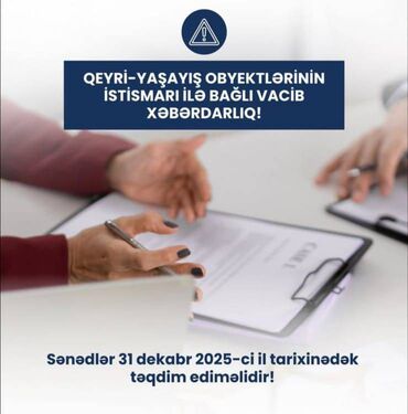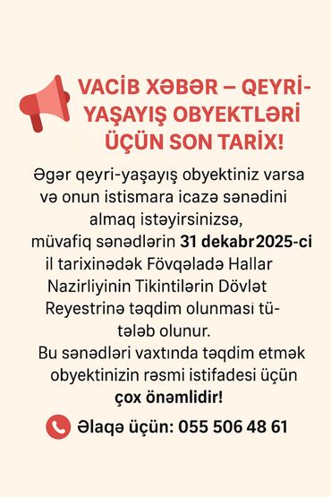 Vətəndaşa məxsus qeyri-yaşayış obyektinin istismarına icazə sənədinin alınmasından ötrü vətəndaş tərəfindən obyektə dair müvafiq sənədlərin 31 dekabr 2025-ci il tarixinədək Fövqəladə Hallar Nazirliyinin Tikintilərin Dövlət reystrinə daxil edilməsi üçün təqdim edilməsi tələb olunur.