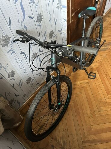 Dağ/şosse üçün universal velosiped - Çərçivə: yüngül alaşımlı, qara rəng üzərində yaşıl detallarla - Təkərlər: 29" dişli MTB şinləri, yüksək tutuşlu protektor - Amortizasiya: ön amortizatorlu çəng...