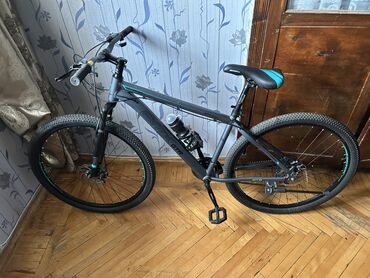 Dağ velosipedi – 26” təkərlər, disk əyləclər, amortizatorlu ön “fork”. - Çərçivə: yüngül və möhkəm alüminium tipli çərçivə, qara rəngdə mavi-qırmızı detallar. - Təkərlər: 26 düym dişli (off-road) ...