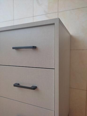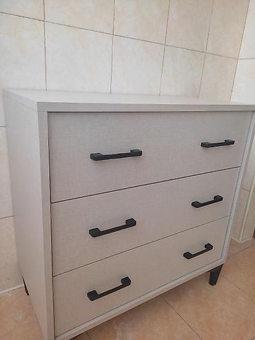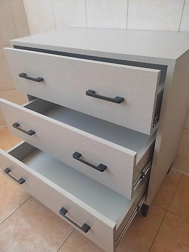 Açıq boz rəngdə, üç çekmeceli, müasir üslubda komod. Qara rəngli dəstəkləri var. Yataq otağı, qonaq otağı və ya dəhliz üçün əla seçimdir. Funksional və praktik mebeldir.