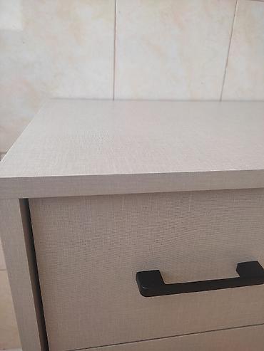 Mebel: 4 çekmecəli komod Ölçü: 80×80×40 sm Dizayn: - Yanlar və üst hissə ağac teksturalı qəhvəyi, ön panellər mat açıq rəngli - Minimalist üslublu, dairəvi qara tutacaqlar - Stabil dayanıqlı korp...