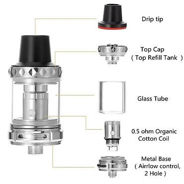 Kompakt, erqonomik korpus, asan doldurma, güc tənzimlənməsi və səmərəli 0.5 ohm coil ilə gündəlik istifadəyə uyğun vape kiti.
