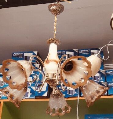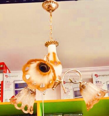 - Dizayn: Klassik floral üslubda, dalğalı uclu şüşə plafonlar və qızılı/krom metal karkas. Mərkəzdə dekorativ elementlər, nazik bükümlü qollar.