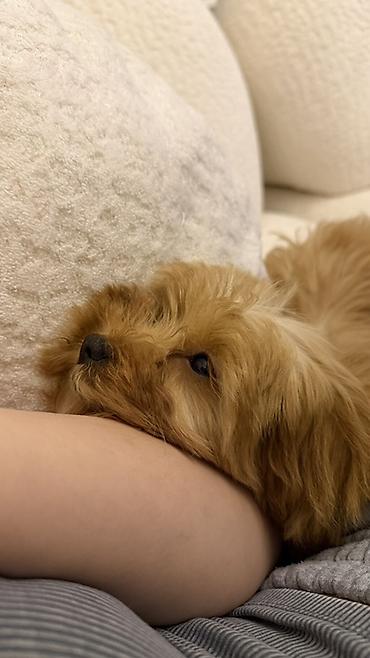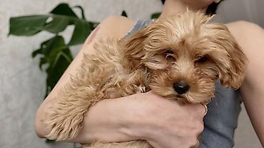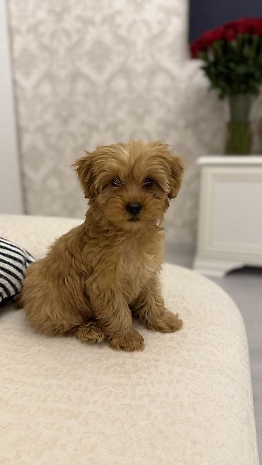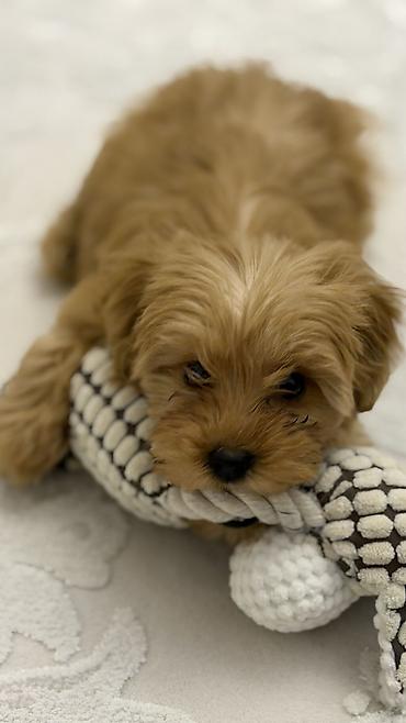 Miniatür ölçülü, qızılı-qəhvəyi tüklü balaca 3 aylıq maltipoo balası.