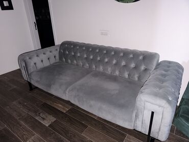 Gümüş-boz rəngdə, məxməri toxumalı, kapitone (düyməli) dizaynlı 3 nəfərlik divan.Açılır(yatağ kimi)