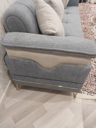 - Rəng və dizayn: Açıq-boz/mavi tonlarda parça, krem əlavələr və qızılı dekor xəttləri. Klassik-modern üslubda, şaquli tikiş panelləri və yumşaq, qabarıq oturacaq-sehpa hissələri.