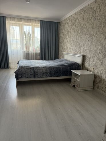 - Yataq otağı: böyük pəncərə/balkona çıxışlı zona, qalın və tül pərdələr, tumba ilə birlikdə yataq, dekorativ divar örtüyü, açıq rəng döşəmə.