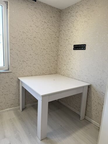 - Mətbəx: ağ, parlaq fasadlı daxili mebel, quraşdırılmış elektrik sobası, üst modul şkaflar, pəncərəli və havadar sahə, pərdə karnizi.