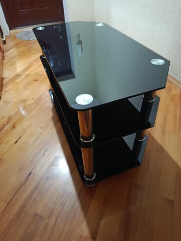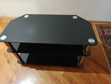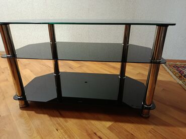 Qara şüşə TV stendi - Material: qalın temperli qara şüşə rəflər, möhkəm metal sütunlar - Konstruksiya: 2 mərtəbəli rəf sistemi; üst rəf TV üçün, alt rəf pleyer, konsol və aksesuarlar üçün - Künclə...