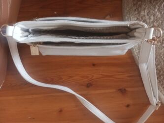 Çanta,yeni.ag rengde.2 kemeri var,biri deriden,digeri qizili reng zencirdir.ziyafetlerde klatç kimi de istifade etmek olar.qiymet 40 manat