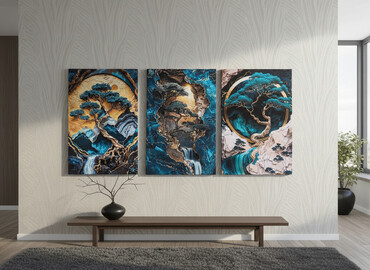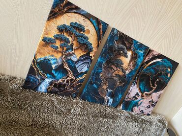 Əl işi yağlı boya tablolar - Dağ mənzərəsi: 40×30 sm — 35 AZN. Qalımlı tekstura, qızılı və mavi tonlar. - Dəniz/abstrakt mənzərə: 30×30 sm — 25 AZN. Dalğa effekti, metalik parıltılar. - Albalı nat...
