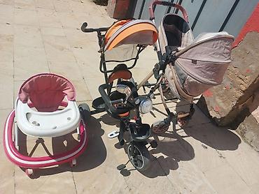 - Uşaq gəzəgəzi (walker): yumşaq parça oturacaq, dairəvi baza, çoxsaylı təkərlər, ön panel üçün yer. Evdə ilk addımlar və hərəkət məşqləri üçün praktikdir.