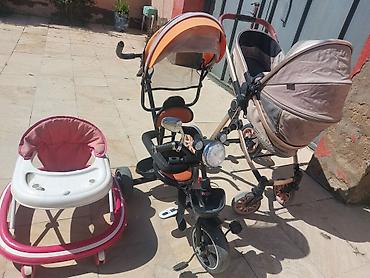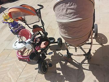 - Valideyn idarəetməli uşaq üçtəkərli velosiped: ön fənər, zəng, təhlükəsizlik üçün qoruyucu barmaqlıq, ayaqaltı, arxa səbət, günqoruyucu tent və itələmə dəstəyi ilə. Pedallı sürüş və ya valideynin yönləndirməsi mümkündür.