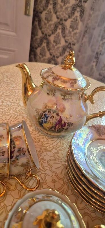 Madonna çay/kofe desti. 6 neferlik. Almaniya. 1 eded çaynik 1 eded süd qabi 1 eded şeker qabi 6 eded nelbeki 6 desert boşqabi 1 eded ortaliq qabi Kocuruk deye coxlu sayda ev, metbex eşyasi, tablo...