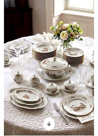 Porselen süfrə dəsti və çay/qəhvə dəsti - Klassik üslubda ağ porselən, qızılı kant və çiçək naxışları - Bir neçə fərqli servis elementləri daxil: • Dərin və yastı yemək boşqabları • Kvadrat ...