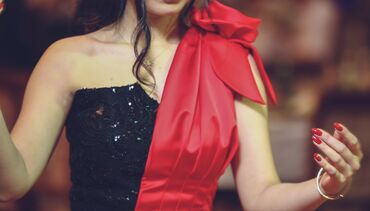 Qadın axşam geyimləri – 3 model. 2defe geyinilib. 1) Qırmızı uzun paltar - Qolsuz, dairəvi yaxalı - Sinə və çiyin hissəsində 3D aplikasiyalar və muncuq bəzəyi - Bel vurğulu, axıcı ətək - Düz, mini...
