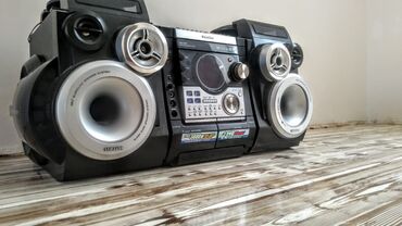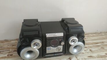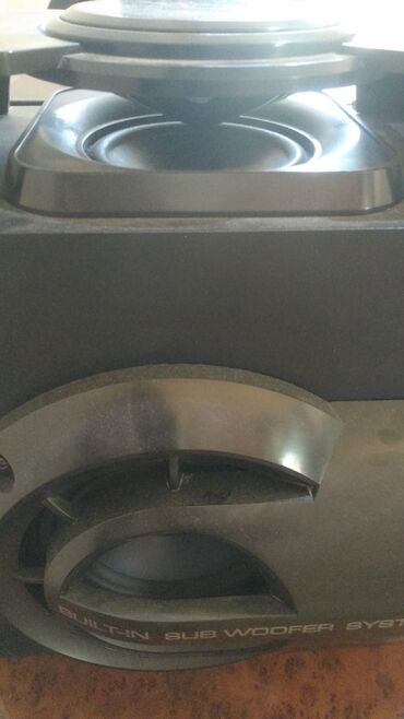 Masaüstü audio sistemi - Komponentlər: subwoofer/əsas gücləndirici bloku (böyük korpus), iki ədəd sütun tipli səsgücləndirici, idarəetmə bloku (səs səviyyəsi üçün böyük fırlanan düymə, ton və reji...