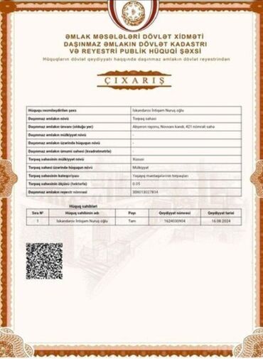 1500 sot, Kənd təsərrüfatı, Mülkiyyətçi, Kupça (Çıxarış)