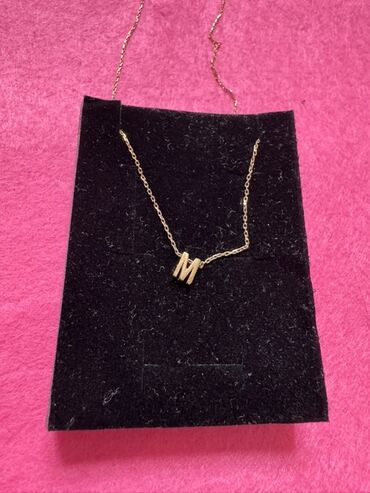 - Qızılı rəngdə zəncir və “M” hərfi şəklində asqı. Nazik, zərif zəncir, mərkəzdə relyefli “M” hərfi.