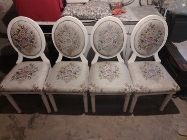 Klassik üslubda 6 ədəd yemək otağı stulu! - Material: bərk ağac karkas, krem rəngli boyama - Naxışlı dekor: bel hissəsində oyma başlıq və zərif kənar haşiyə - Oturacaq və arxa hissə: atlas parça t...