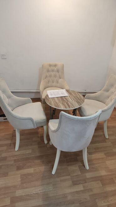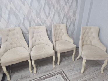 4 ədəd yumşaq oturacaqlı kreslo dəsti - Rəng: krem/bej - Material: məxməri tipli yumşaq parça üzlük, dekorativ düyməli kapitone arxa hissə - Ayaqlar: ağ/krem rəngli taxta, qıvrımlı (klassik stil) ...
