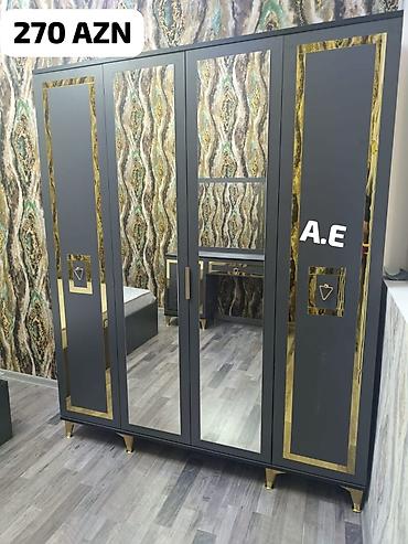 kupe dolab - Ölçü: 160 x 200 x 60 sm (eni x hündürlük x dərinlik) - Minimalist dizayn, ön paneldə xrom dekor zolaqları - Sürüşən qapı mexanizmi - Daxili quruluş: bir bölmədə bir neçə rəf, aşağıda ...