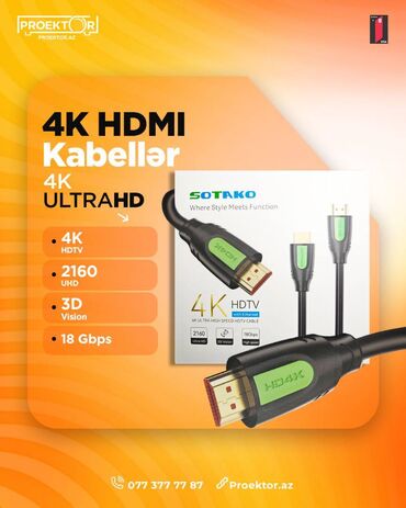 4K HDMİ kabellər 4K HDMİ kabellər. Yüksək görüntü kefiyyəti. HDMİ versiya 2.0 sürətli görüntü ötürmə. kefiyyətli material. filterli. 5 metr -15 azn 10 metr- 25 azn 15 metr- 40 azn 20 metr- 50 az...