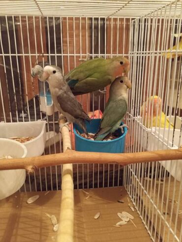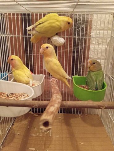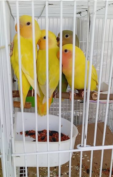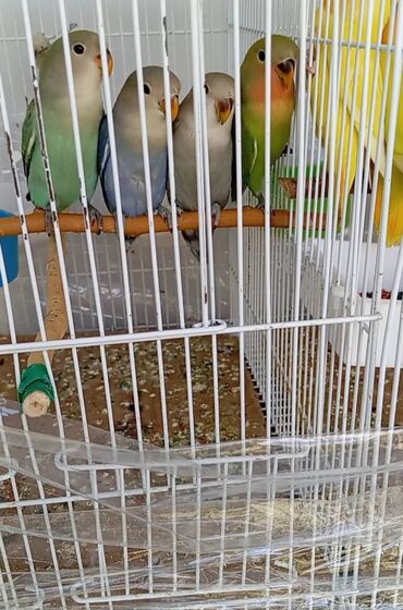 Məhsul: Agapornis (sevda) cüt papuqaylar Təsvir: - Kafesdə saxlanılan iki rəngarəng agapornis cütü - Rənglər: yaşıl-gövdəli, çəhrayı-qırmızı başlı; sarı-gövdəli, çəhrayı-qırmızı başlı - Aktiv və s...