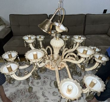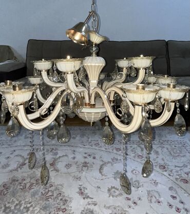 Şüşə-kristal tavan lampası (plasfon) - Forma: dairəvi, yarı-qapalı tavan tipli - Material: parlaq xrom rəngli korpus, kəsimli kristal elementlər və şüşə bəzəklər - Dizayn: ağ fon üzərində qızılı ç...