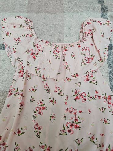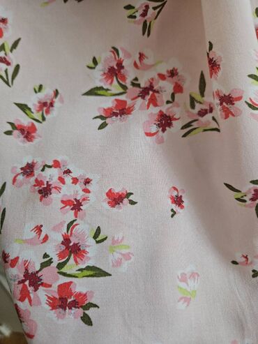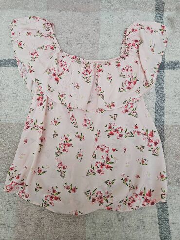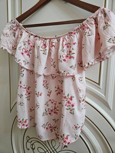 Qadın köynəyi/bluz - Rəng: açıq mavi - Naxış: tünd mavi konturlu iri çiçək printi - Yaxa: dayaqsız/mandarin yaxa, üstündə düymə bağlama - Bağlanma: ön hissədə tam düyməlidir (örtülü düymələr) - Qol...
