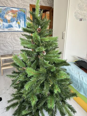 Süni Yeni il şam ağacı və bəzək dəsti - Realistik iynələrə malik, budaqları sıx süni şam ağacı - Ölçü: təxminən 1,6–1,8 m hündürlük (fotolara baxın) - Üç hissədən yığılır, möhkəm metal dayaq üzəri...