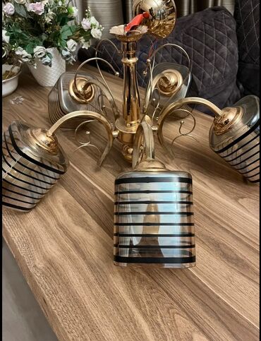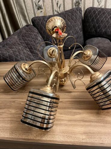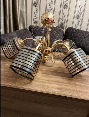Tavan lustrası – 5 lampalı, klassik qızılı korpuslu model.
