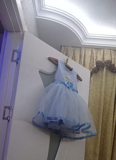 Uşaq/gecəlik ziyafət paltarı – açıq mavi rəngdə. 1defe de geyinilmeyib,cox gozel - Model: yuxarı hissəsi krujeva (naxışlı) parçadan, aşağı hissəsi çoxqatlı şifon/orqanza ətək - Üst hissədə daş və ...