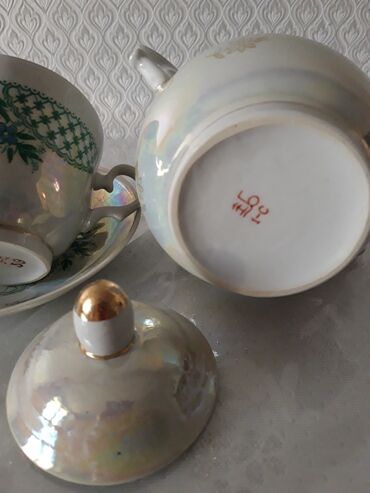 Porcelain çay-servis dəsti: - İstehsalçı nişanı: ЛФЗ (Leningrad Porcelain Factory), - Material: yüksək keyfiyyətli farfor - Dizayn: ağ əsas üzərində yaşıl-sarı-qəhvəyi yarpaq və budaq ornamentləri...