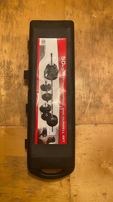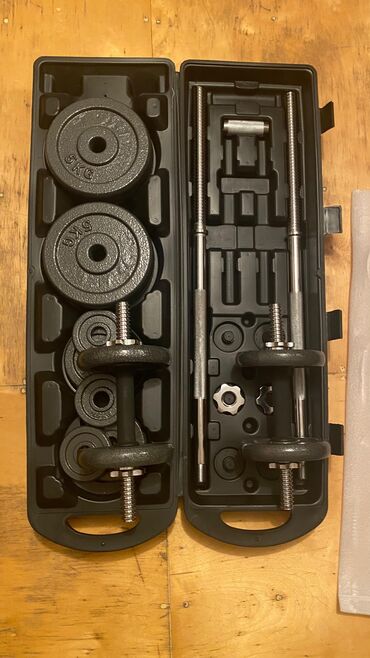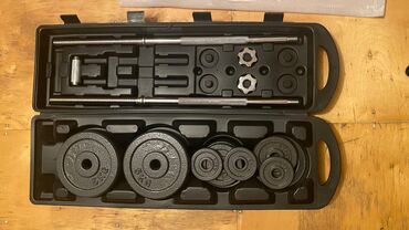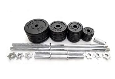 - Komplekt: müxtəlif çəkili döküm disk lövhələri, 1 ədəd yığıla bilən ştanq (bir neçə boru hissədən), 2 ədəd dambbell qolu, 6 ədəd ulduz formalı sıxac/bolt, 1 ədəd T-tip açar.