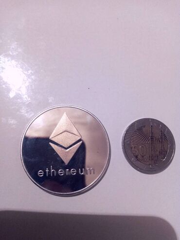 Ənənəvi Bitcoin hədiyylik qəpiyi. Üzerinə Bitcoin logosu həkk olunan suvenir sikkeler – 5 AZN /Efirim/Ethereum kriptovalyutun fiziki nümunə sikkesi; monetalar/qeyri-valyuta sikkələr. Eterium təqlid...