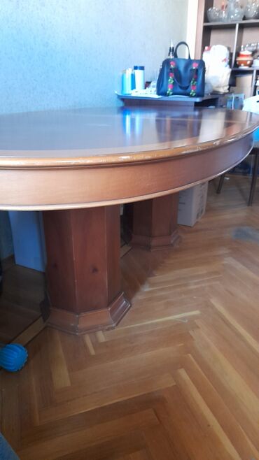 Oval formal yemək masası - Material: tam ağac konstruksiya, qalın massiv üst hissə - Rəng və dizayn: tünd qəhvəyi masaüstü üzərində açıq qəhvəyi kənar və X-şəkilli intarsiya bəzəyi - Ölçü: iri ölç...