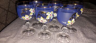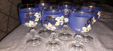Kobalt rəngli, qızılı naxışlarla bəzədilmiş, zərif ayaqlı, nazik şüşədən hazırlanmış şərab stəkanları dəsti. Hər bir stəkan zərif çiçək təsvirləri ilə bəzədilib. Evdə xüsusi günlərdə və ya qonaqlar...
