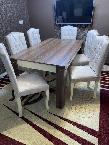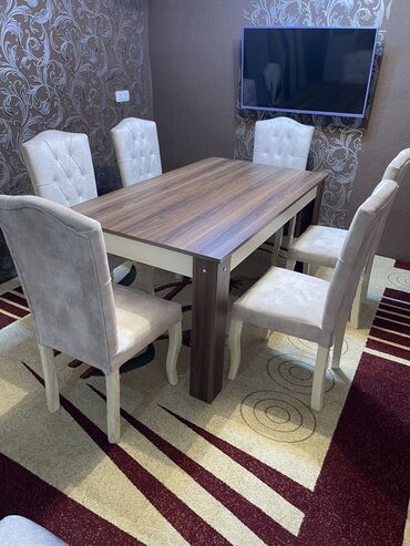 - Ölçü (təxmini, şəkillərə əsasən): orta ölçülü düzbucaqlı masa, ailə yeməkləri və qonaq qəbuluna uyğun