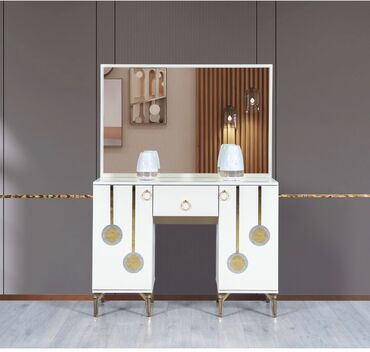 - Tualet/kozmetik masa: geniş güzgü, mərkəzdə çekmece, yan qapılı bölmələr, metal halqa formalı tutacaqlar və qızılı xətlənmələr.