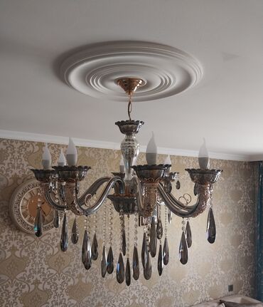 - Bəzək: tüstü rəngli kristal/şüşə damcı asmalar və kristal zəncirlər