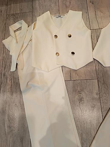 Uşaq kostyum dəsti – Aztur Çocuk Giyimi - Rəng: açıq bej (smokin üslublu) - Dəst tərkibi: - Ağ uzunqollu köynək - Bej jile (iki cərgə düyməli, dekorativ zəncir və nişanlı) - Bej qalstuk-kəpə...